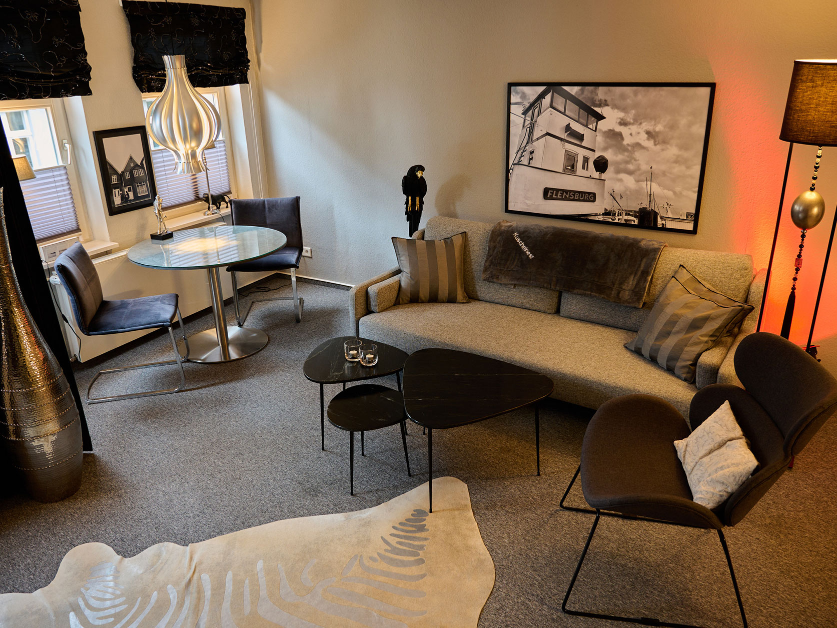 Die Lage im 2. Stock unseres Hauses in Richtung Fußgängerzone bietet einen imposanten Blick bis zum lebendigen Nordermarkt mit seinen vielen Restaurants und Cafés. Das Schlafzimmer liegt nach hinten zum Hof und bietet erholsame Ruhe in der Nacht. Im Innenhof stehen Ihnen Gartenmöbel für Ihren Aufenthalt zur Verfügung.